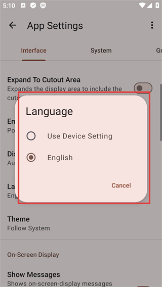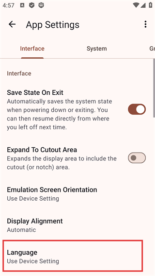 3、进入【App-Settings】的【Interface】标签页,点击【Language】界面相关设置。