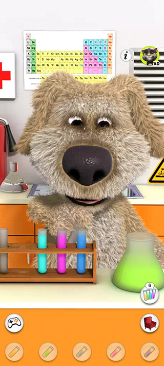 3、化学实验玩法:可爱的本还可以做实验,按下化学按钮,带本去实验室,通过混合不同颜色的试管观看各种神奇的化学反应。