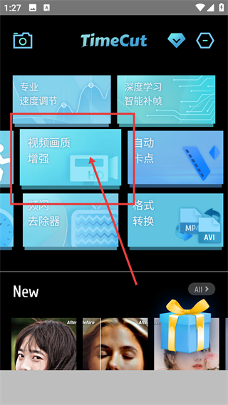 1、在【TimeCut】主界面点击【视频画质增强】功能卡片,就能进入该功能的详情页面,准备优化视频画质啦。