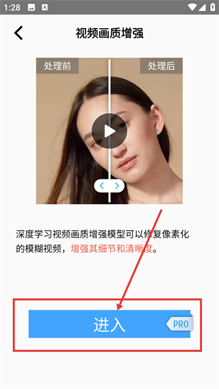 2、进入【视频画质增强】详情页后,点击底部的【进入】按钮,就能启动该功能的使用流程哦。