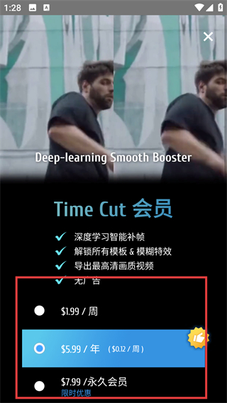 3、点击【进入】后会弹出【TimeCut会员】购买页面,选择对应套餐即可解锁该功能的完整权限啦。