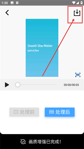 4、完成画质增强处理后,点击右上角的下载按钮,就能将【HD处理后】的视频保存到设备中啦。