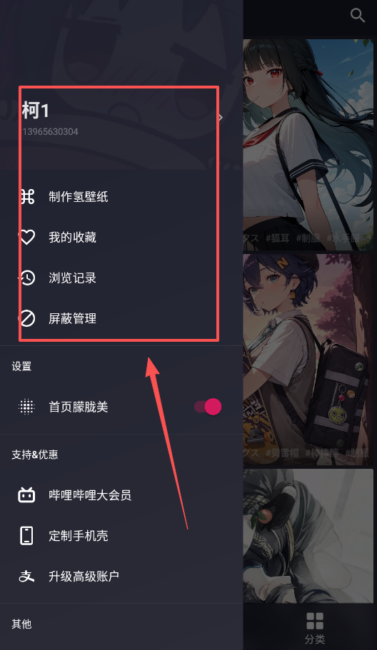 4、软件还提供“哔哩哔哩大会员”支持和“定制手机壳”等优惠,在“其他”选项中能探索更多功能,让壁纸使用体验更丰富多样呢。