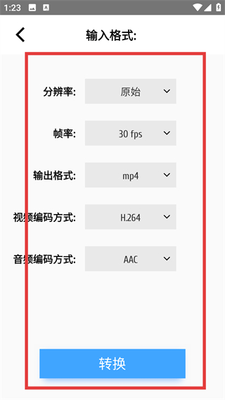3、在视频预览页点右上角的确认按钮,就能进入格式转换的参数配置界面,调整输出参数啦。