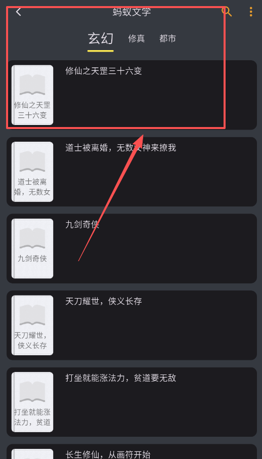 3、接着呢,搜索页找到想看的作品后,比如在蚂蚁文字里看到“修仙之天罡三十六变”,直接点击封面或书名就能开始阅读啦。