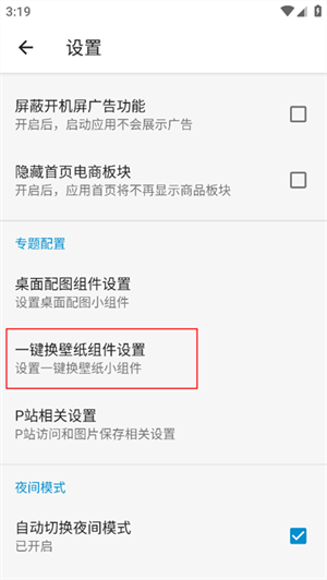 3、在设置中找到一件切换壁纸组件选项并点击打开