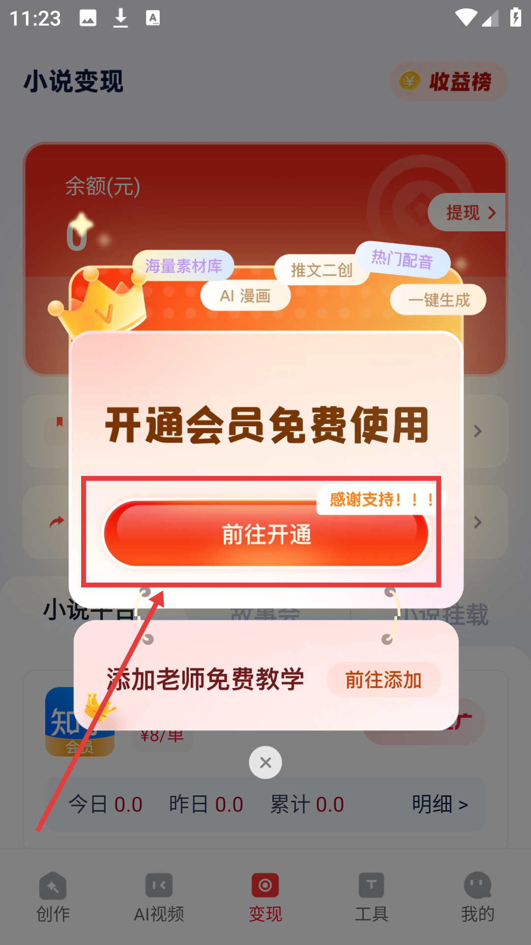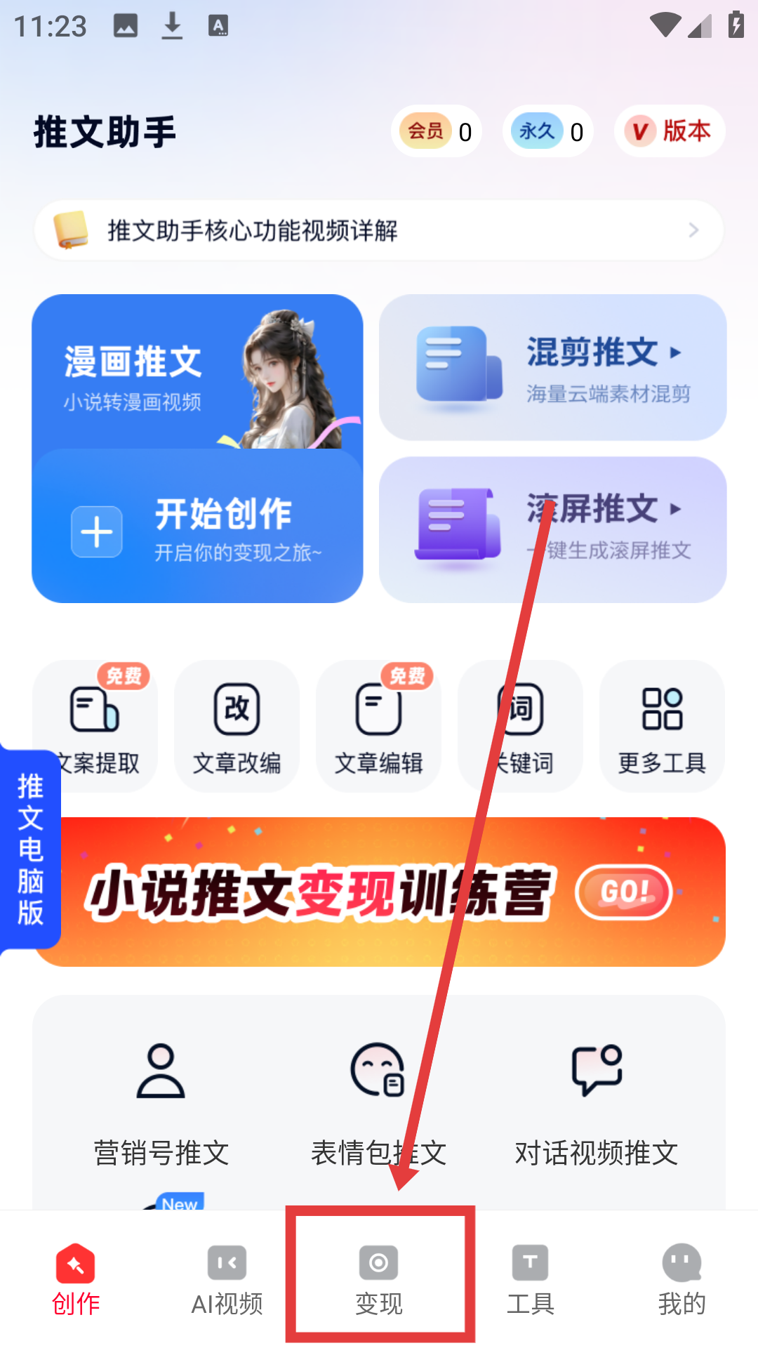1、在推文助手首页,点击底部【变现】,可进入小说变现页面,准备进行推广或会员开通操作啦。