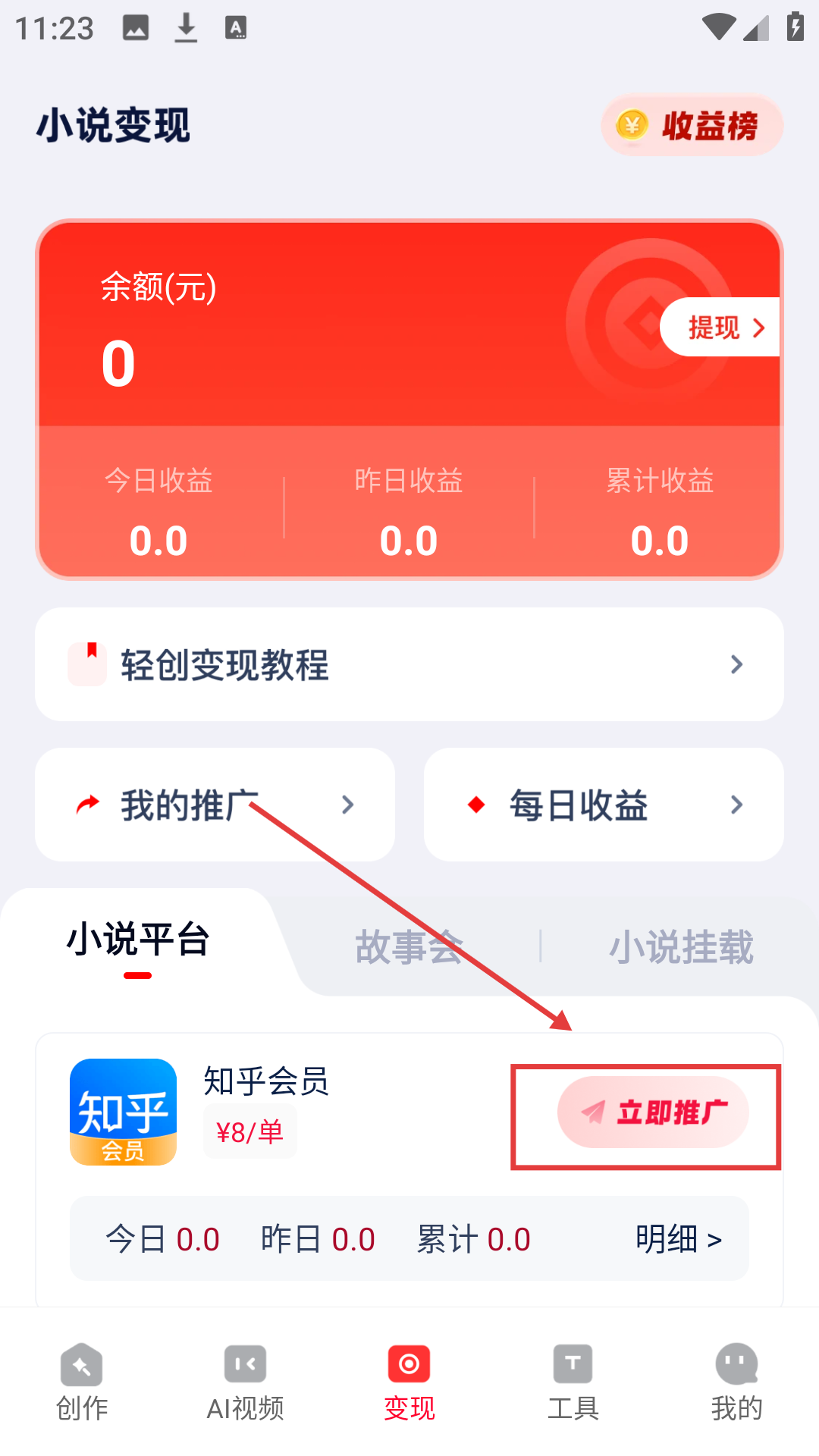 2、进入变现页面后,点击小说平台旁的【立即推广】,可触发会员开通提示哦。