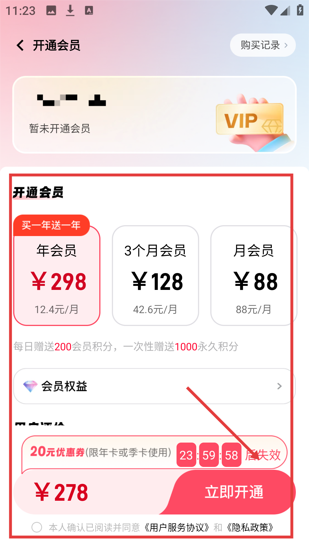 4、在开通会员页面,可选择会员类型,如年会员等,点击【立即开通】即可完成会员开通,享受会员权益哦。
