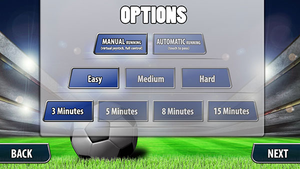 3、选择好球队后进到“options”选择界面,可以选择游戏自动或手动奔跑,游戏难度以及时长。