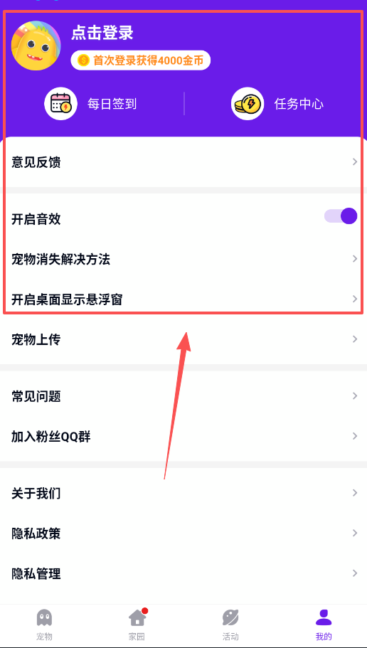 一、打开软件先进入我的页面,完成登录领取4000金币,在任务中心完成任务获取奖励,如果需要帮助可以查看常见问题或反馈意见。