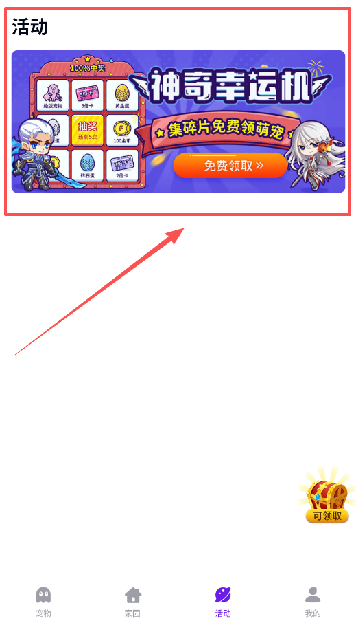 三、活动页面提供多种奖励方式,包括神奇幸运机抽奖、绝彩宝箱开启,还能通过收集碎片免费兑换萌宠,记得常来看看可领取的奖励。