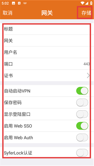 2、进入网关填写页后,填好【标题】【网关】等信息,按需开启功能开关,再点右上角【存储】保存哦。