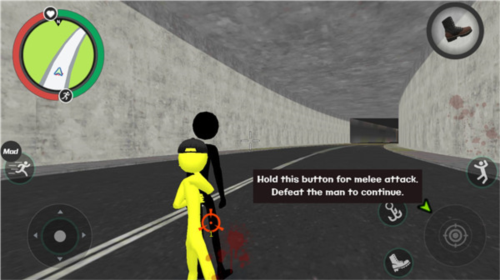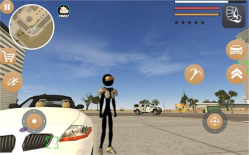 左侧移动、加速,右侧绳索,攻击(跳跃),跳跃,右上侧的武器更换以及血量、经验的显示都实时更新,一览无遗,凭借着大家自由的玩法,与其他帮派的人物进行交火,期间杀人能够获得经验,杀多了会产生星级,警察和其他附近角色会特殊照顾你对你展开火热的进攻,而如何存活,如何将其他人物击杀则是你所需要完成的任务。