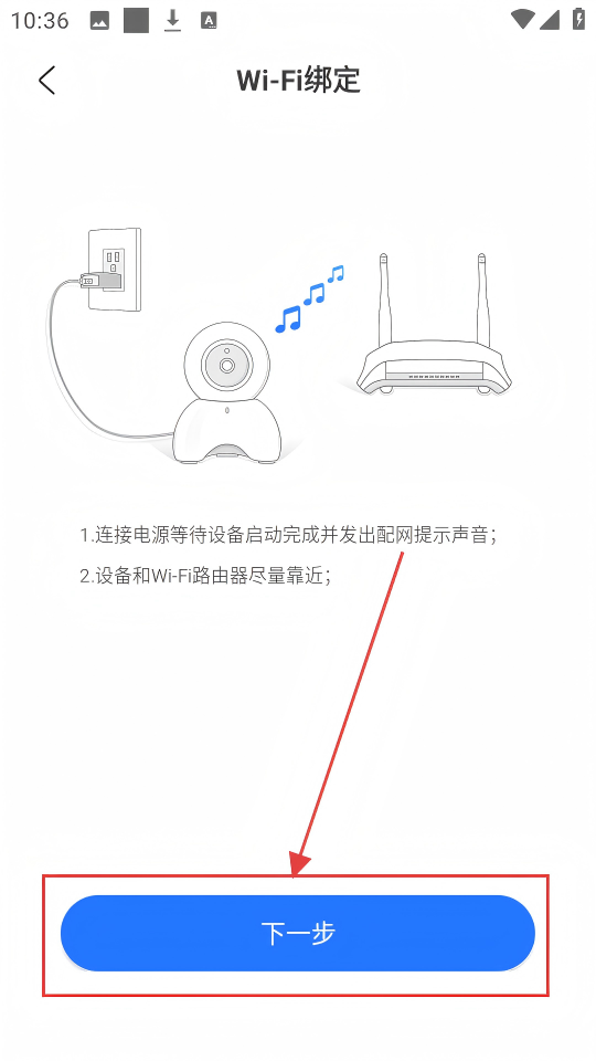 2、进入WiFi绑定页面,按提示连接电源等设备启动,然后点击【下一步】。