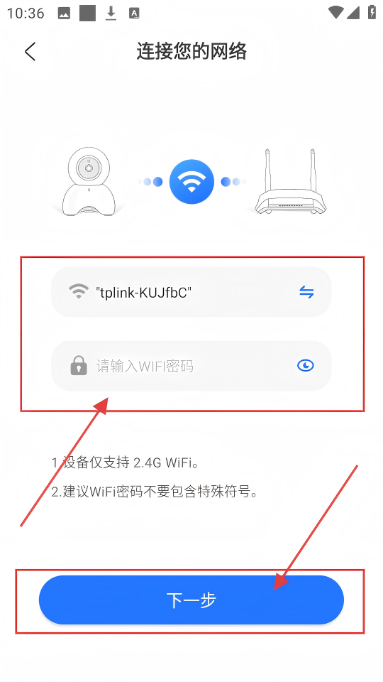 3、在连接网络页面,输入WiFi密码,确认无误后点击【下一步】继续操作。