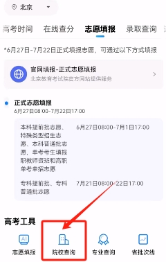 3、我们点击下方的“院校查询”,在这个功能中,我们可以看见你所选的位置的所有大学。
