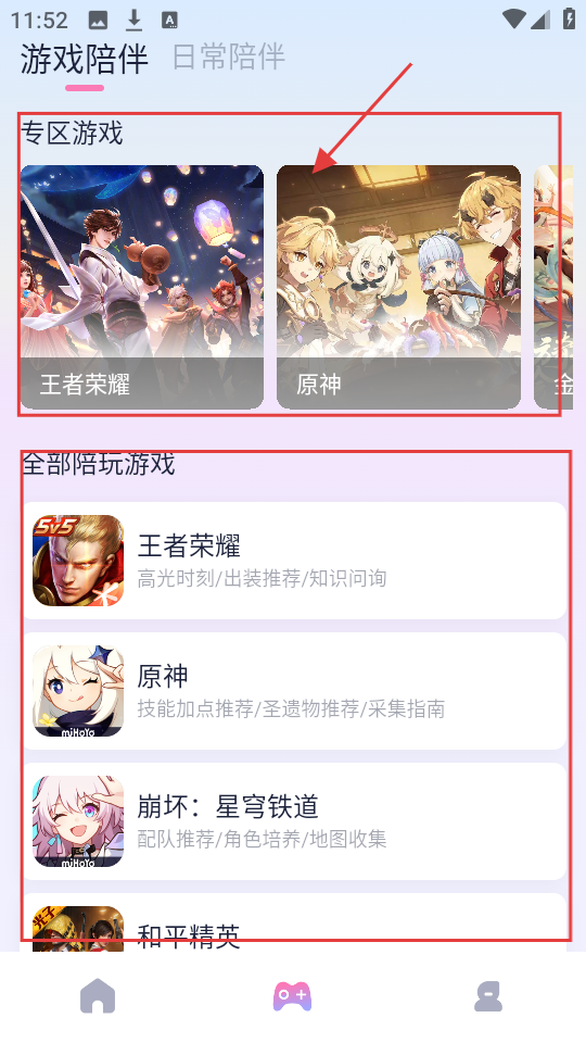1、我们进入软件,若想体验游戏陪伴,点击底部游戏手柄图标,就能进入游戏陪伴相关页面啦。