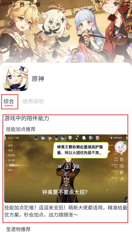 3、进入《原神》详情页的综合板块,能看到游戏的陪伴能力等内容,比如技能加点推荐,方便我们了解游戏玩法。