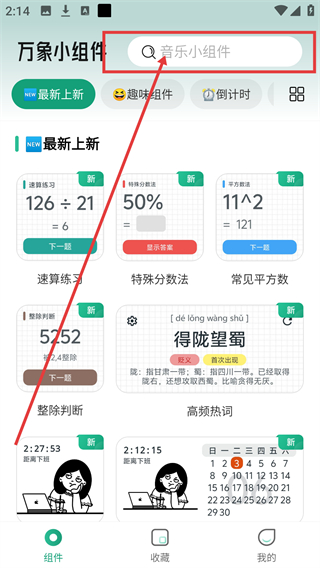 1、在组件页,点顶部的【搜索:音乐小组件】框,可进入搜索界面,查找想要的小组件类型哦。