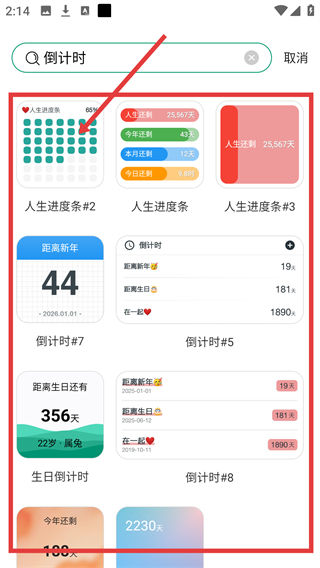 3、搜索【倒计时】后,会出现相关的小组件列表,选心仪的组件就能进入详情页啦。