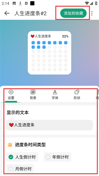 4、在组件详情页,可调整显示文本、时间类型等设置,还能点【添加到收藏】保存组件哦。