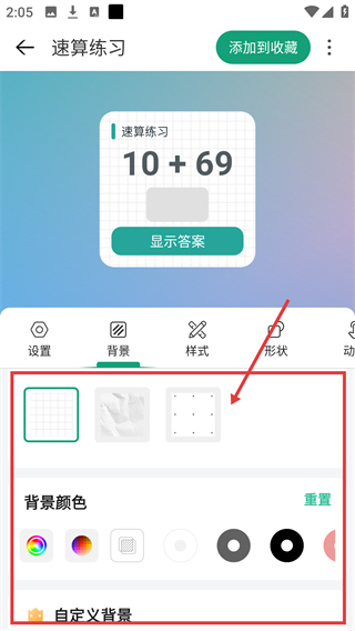 2、进入速算练习详情页后,找到底部的【背景】选项并点击,可展开背景相关的设置界面哦。