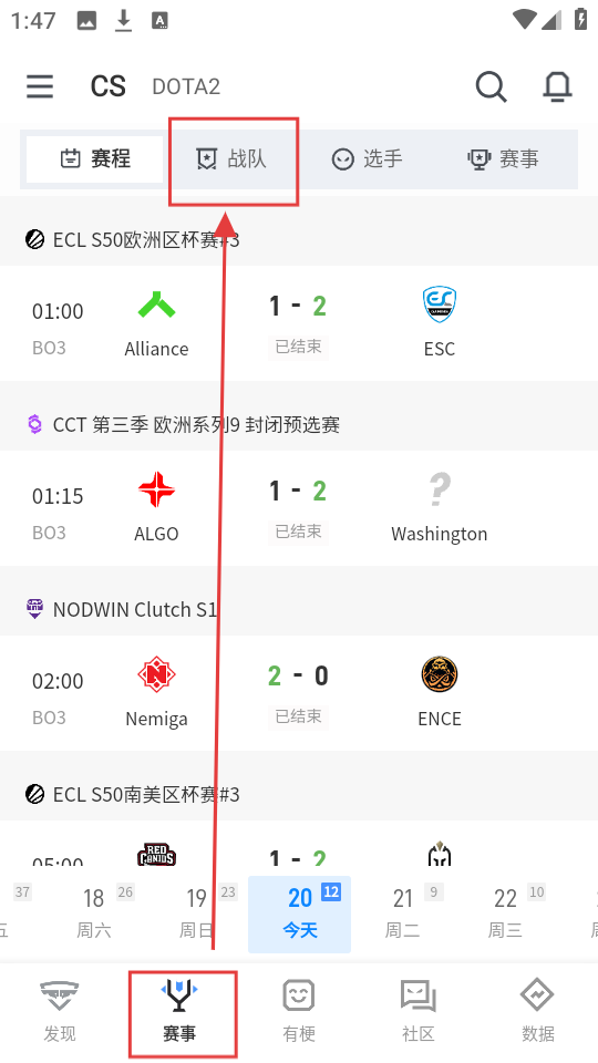 1、我们进入“赛事”页面,若想查看战队相关信息,点击【战队】,就能进入战队列表页面啦。