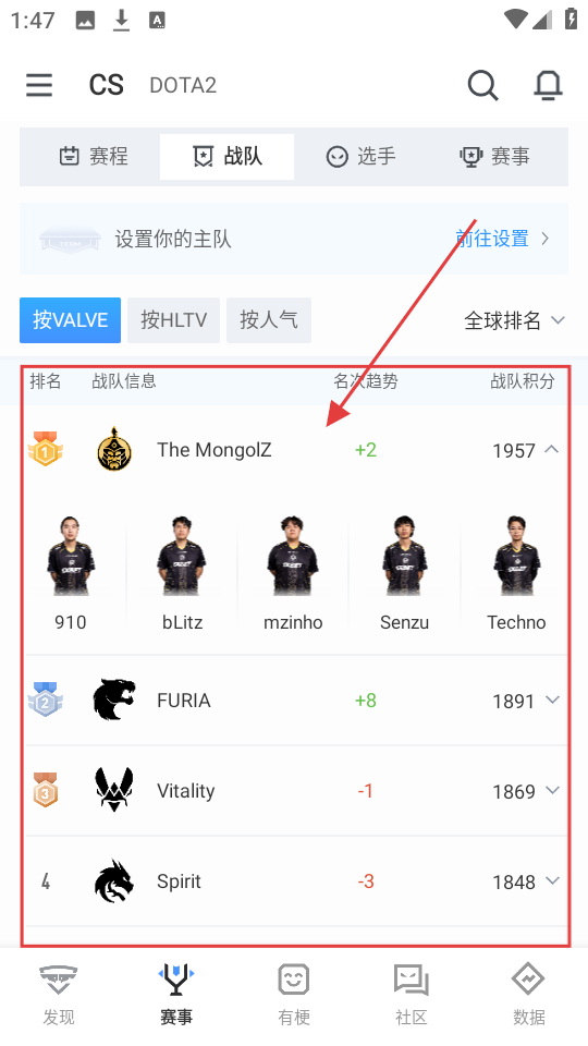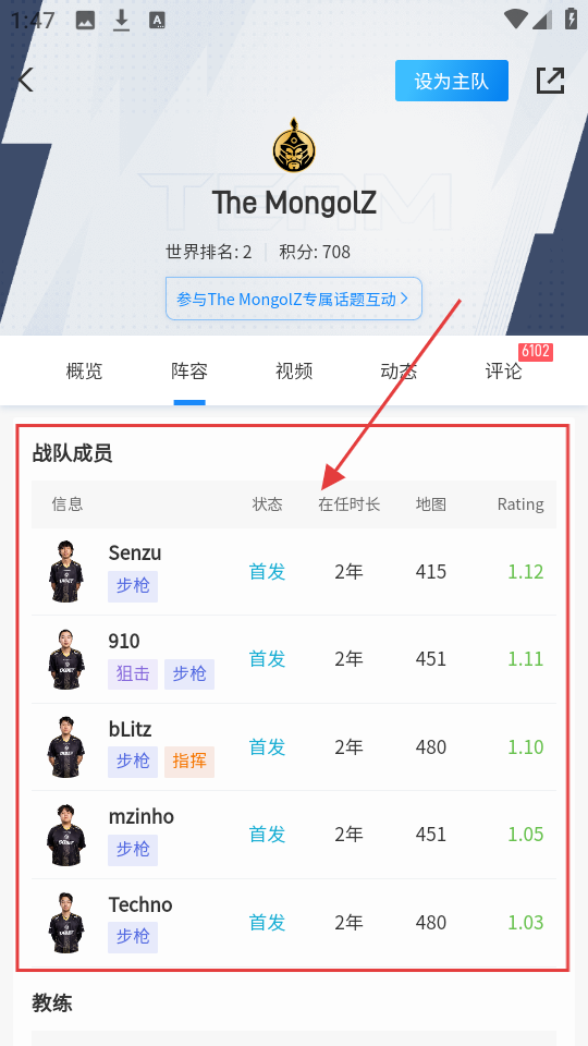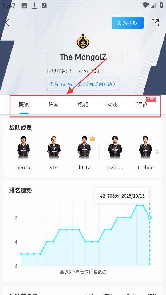 2、在战队列表页面,若想查看某支战队详情,点击对应的战队,比如【TheMongolZ】,就能进入该战队详情页面哦。