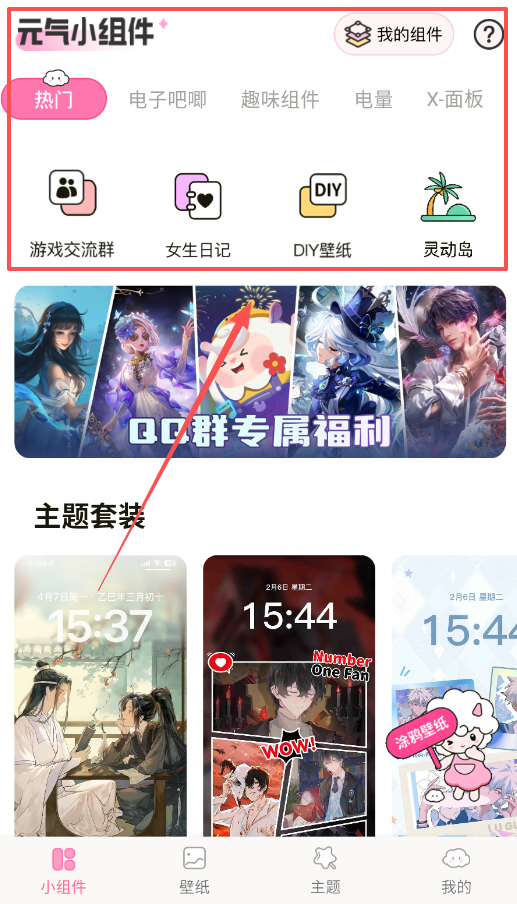 1、打开元气小组件应用,你会看到底部有小组件、壁纸、主题和我的四个主要板块。