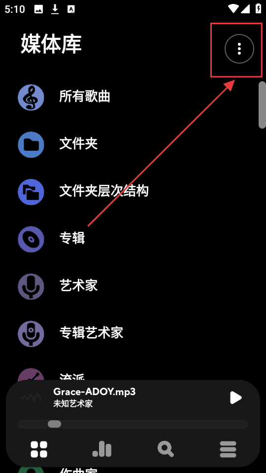 1、我们在媒体库界面,点击右上角的三点图标,就能打开操作菜单,查看更多功能选项啦。
