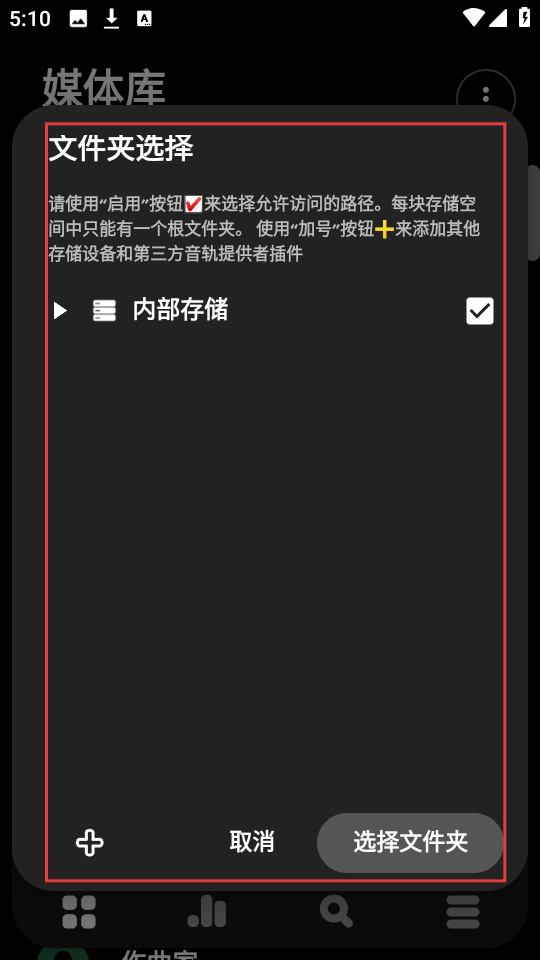 3、进入文件夹选择页面后,我们选择允许访问的存储路径(如【内部存储】),然后点击【选择文件夹】。