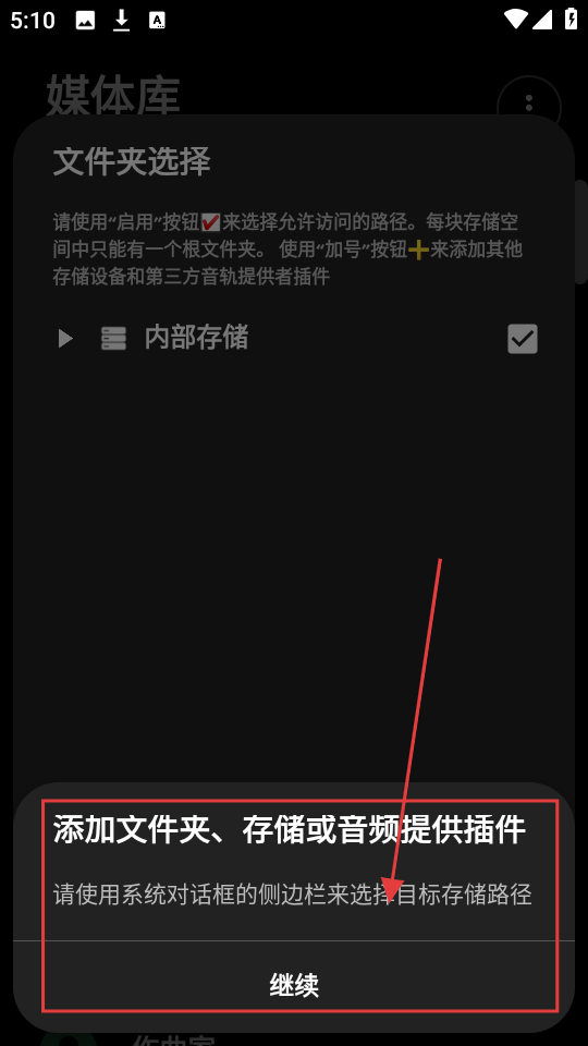 4、点击选择文件夹后,若需添加相关插件等,会出现提示,我们点击【继续】,就能按指引进行后续操作啦。