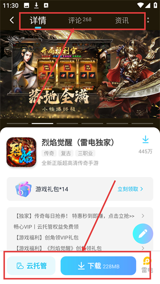 2、进入游戏详情页后,点【下载】按钮能开始下载游戏,也能领游戏礼包获取福利啦。