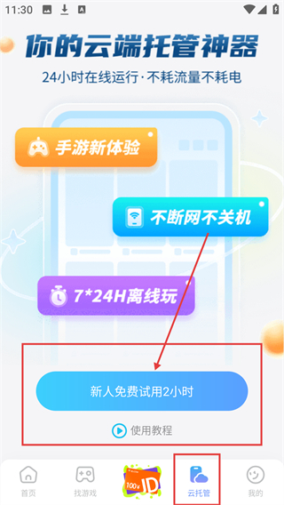 4、在云托管页,点【新人免费试用2小时】按钮,可体验云端托管游戏的功能啦。