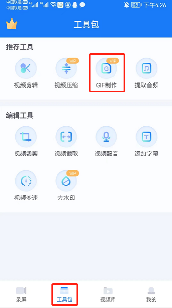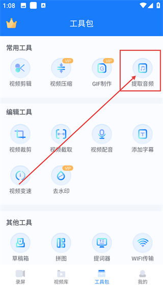 1、在工具包页面的常用工具板块,点击【提取音频】功能按钮,就能进入音频提取的素材选择页面啦。
