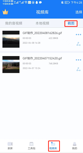 6.保存完成,可以点击【视频库】-【截图】进行查看GIF动图
