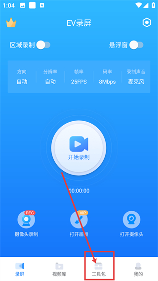 1、在录屏页点底部【工具包】选项,能进入工具列表界面,后续可选视频剪辑等功能处理素材啦。