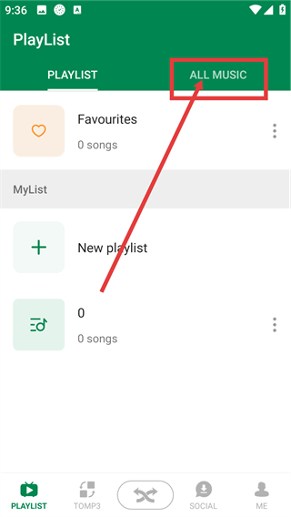 1、在【PlayList】页面点击顶部【ALLMUSIC】选项,就能切换到所有音乐的列表页面,查看已有的音频文件啦。