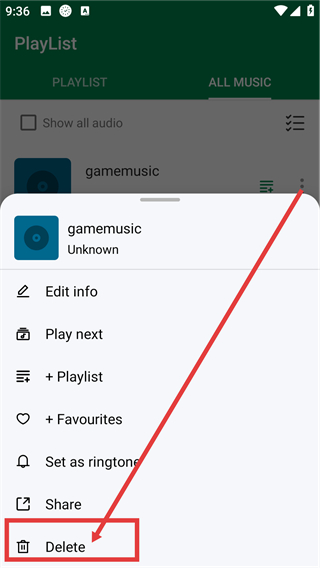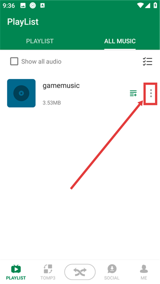 2、进入【ALLMUSIC】列表后,找到目标音频【gamemusic】,点击它右侧的三点按钮,就能打开该音频的操作菜单哦。