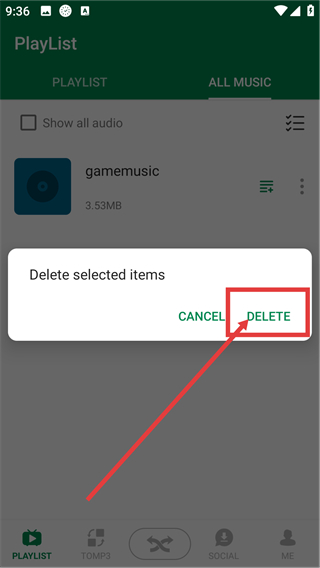 4、在【Deleteselecteditems】弹窗中点击【DELETE】按钮,就能确认删除选中的【gamemusic】音频文件咯。