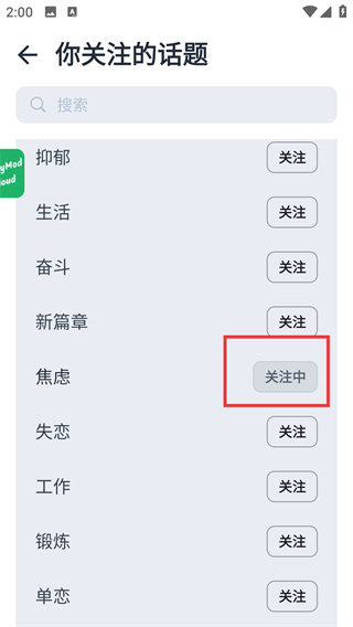 4、选择目标话题后点击其右侧的【关注】按钮,按钮会变为【关注中】,代表成功关注该话题啦。