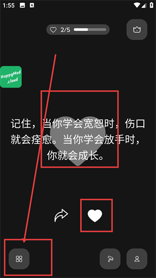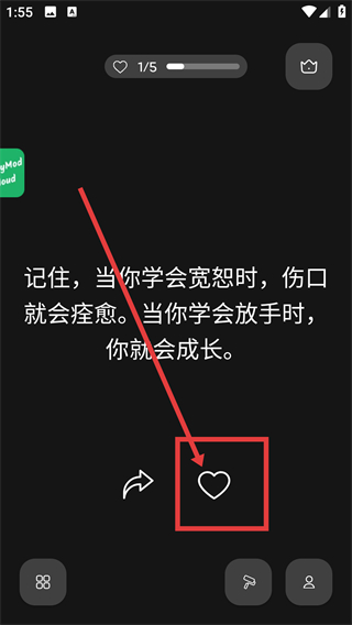 1、在语录展示页点下方的【心形】按钮,能将当前语录加入喜欢列表,同时进度条会更新哦。