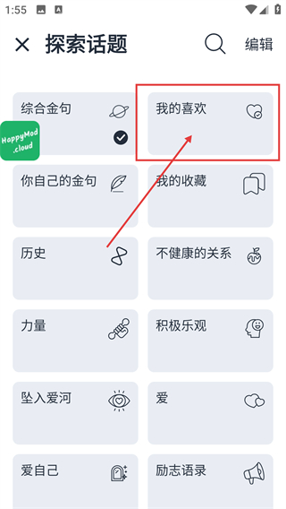 3、在探索话题页选【我的喜欢】选项,能进入喜欢列表页面,查看已收藏的所有语录内容哦。