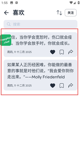 4、进入喜欢列表页后,能看到所有已收藏的语录,还能对这些语录进行分享、收藏等操作呢。