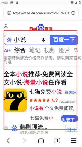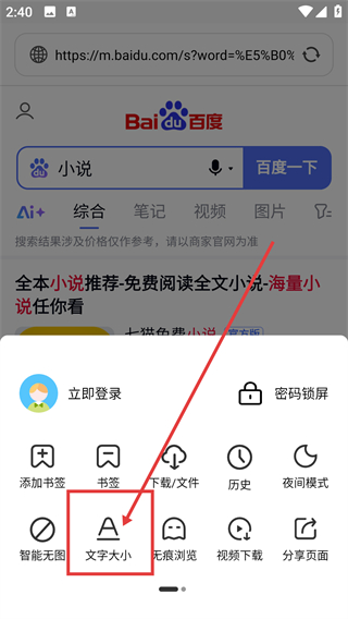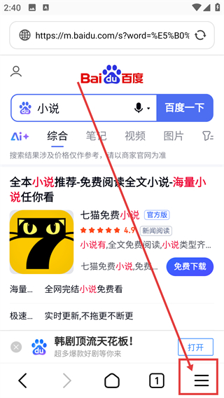 1、在百度搜索页面点击底部的菜单按钮,就能展开功能选项列表,找到调整阅读体验的相关设置啦。