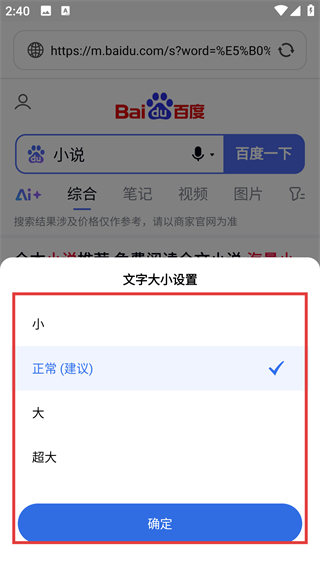3、在文字大小设置界面选择想要的字号(如小、正常、大等),选好后点击【确定】就能应用新的字号啦。