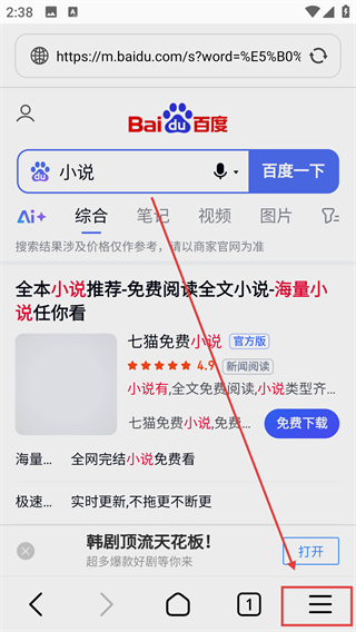 1、在百度搜索结果页点底部的【三横线】按钮,能展开功能菜单,后续可找到书签相关操作啦。