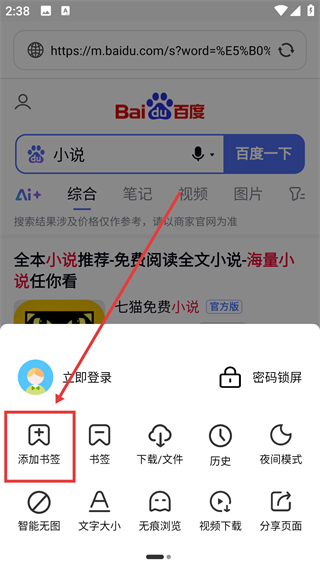 2、展开功能菜单后点【添加书签】选项,能将当前搜索页面加入书签,方便后续快速访问哦。