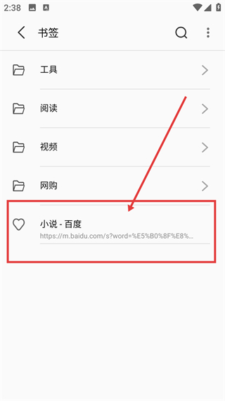 4、在书签列表页能看到刚添加的【小说-百度】书签,后续点它就能直接回到对应的搜索页面啦。